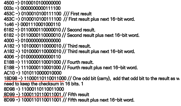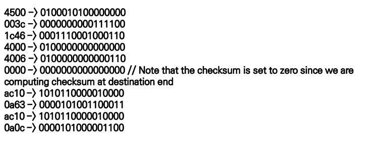 예제 : 헤더의 각 필드 값이 다음과 같이 16진수로 주어질 경우, 체크섬 예제