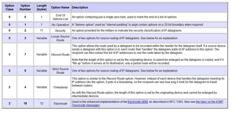 Strict source and record route (SSRR, 엄격한 소스 및 경로 기록) : 데이터그램이 오직 지정된 노드만을 경유하도록 한다.