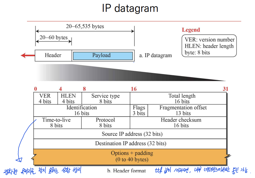 Time-to-Live (TTL, 8bits) : 데이터그램의 생존 시간으로, 데이터그램이 목적지를 찾지 못한 상태로 네트워크 상에 존재하는 상황을 방지한다.