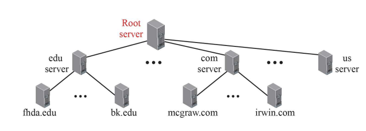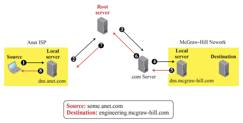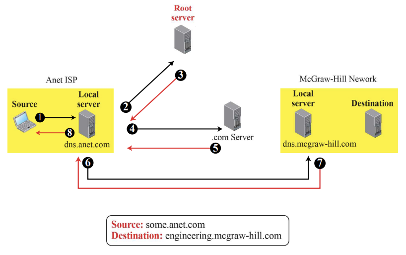 요청은 로컬 서버로부터 Root 서버, DNS 서버를 거쳐 mcgraw-hill network의 로컬 서버에 도착한다.
