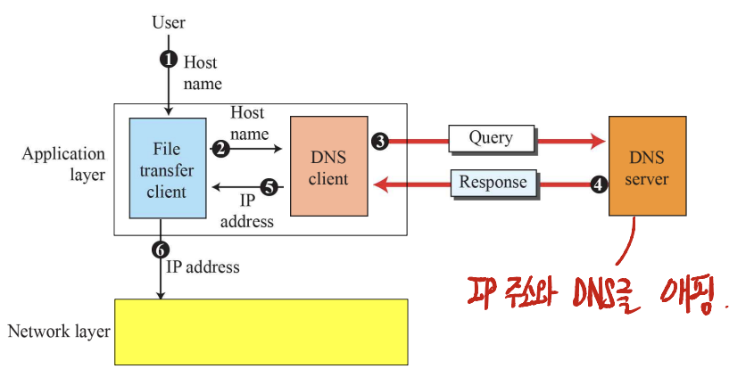 애플리케이션 계층의 파일 전송 클라이언트는 입력된 도메인을 DNS 클라이언트에 전달한다.