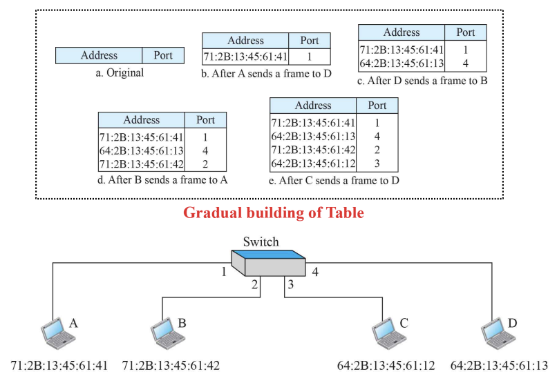 데이터 링크 계층 스위치 (Learning Switch) : 프레임에 포함된 MAC주소를 확인하고, 해당 MAC주소 기반으로 프레임을 적절한 포트로 전달한다.