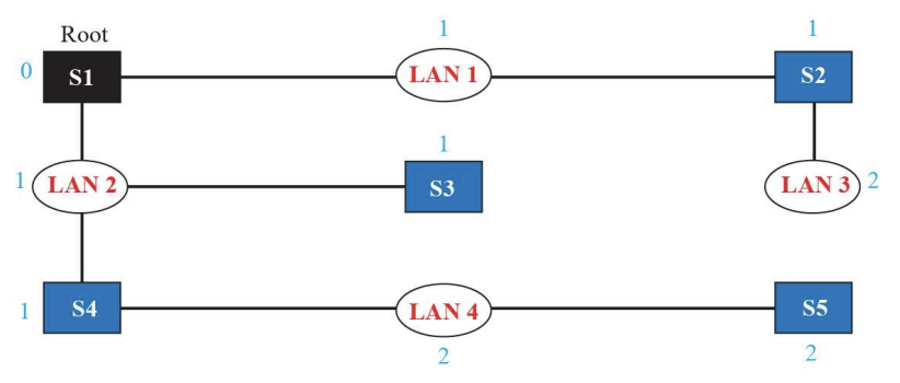 2). 각 스위치에서 루트 스위치까지의 최단 경로를 갖도록 하는 포트를 루트 포트로 선택한다.
