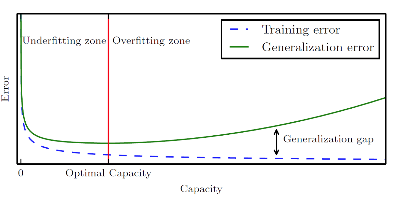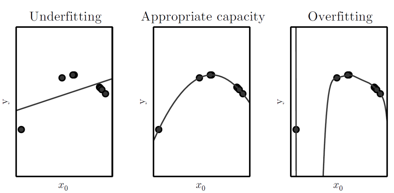 Model Capacity가 작은 모델은 지나치게 단순한 구조일 가능성이 높다. 이는 복잡한 연산이 불가능하다는 의미이며, 과소적합(Underfitting)의 위험성이 존재한다.