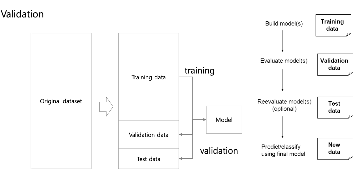 Validtaion Dataset : 학습 중간에 모델 성능을 평가하고 튜닝하기 위한 데이터셋
