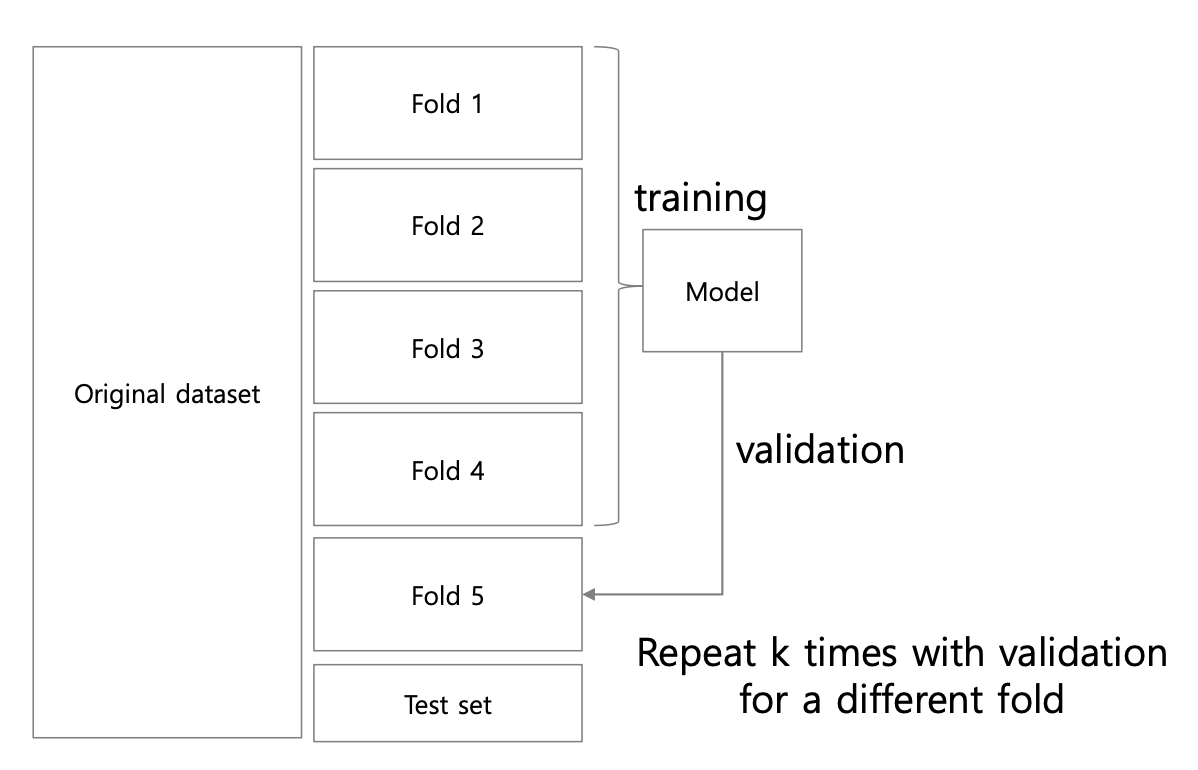 4) 총 번 반복하여 전체 fold를 한번씩 validation dataset으로 사용