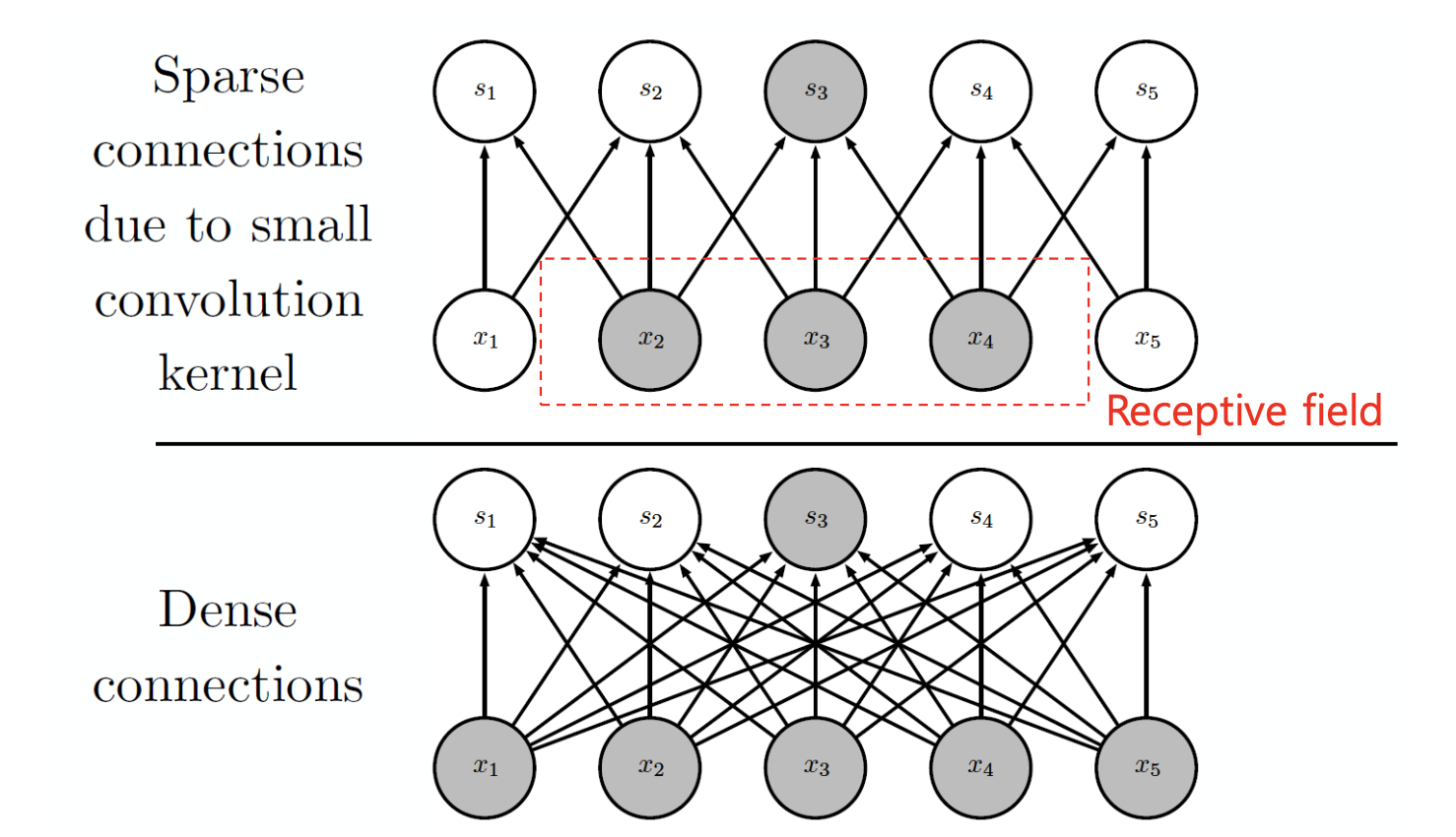 희소 연결(Sparse connections) : 고정된 크기의 필터에 의해서 합성곱 연산이 진행된다. 이로 인해 연산 효율성이 높으며, 지역적 특징을 더 잘 학습할 수 있다.