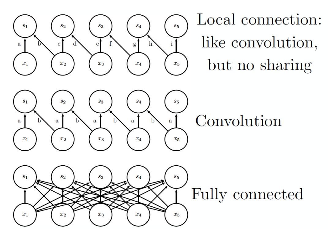 반면 희소 연결(Sparse connection)의 경우, 일부 지역에 대해서만 합성곱 연산이 진행되므로 연산량이 적고 이미지의 지역 특징을 잘 추출할 수 있다.