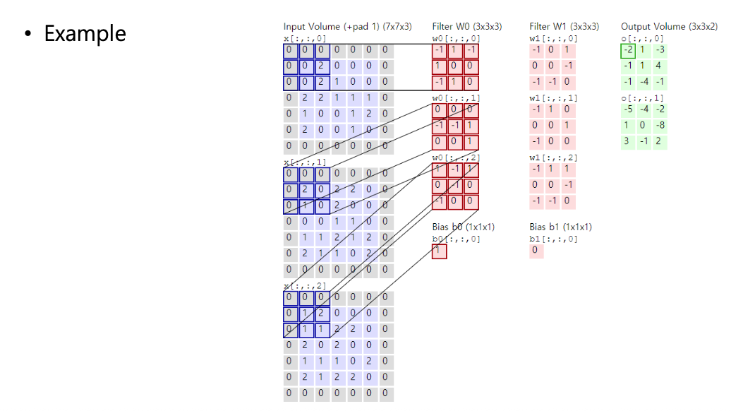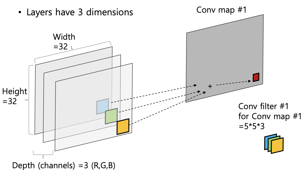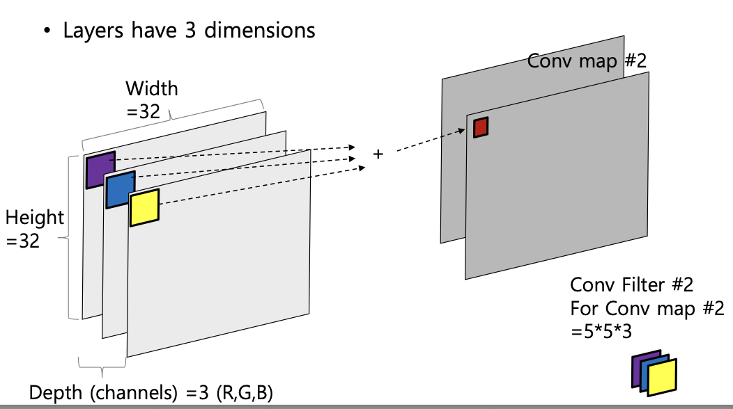2) 각 필터를 적용한 결과를 모두 합산하여 1개의 Convolution map 생성