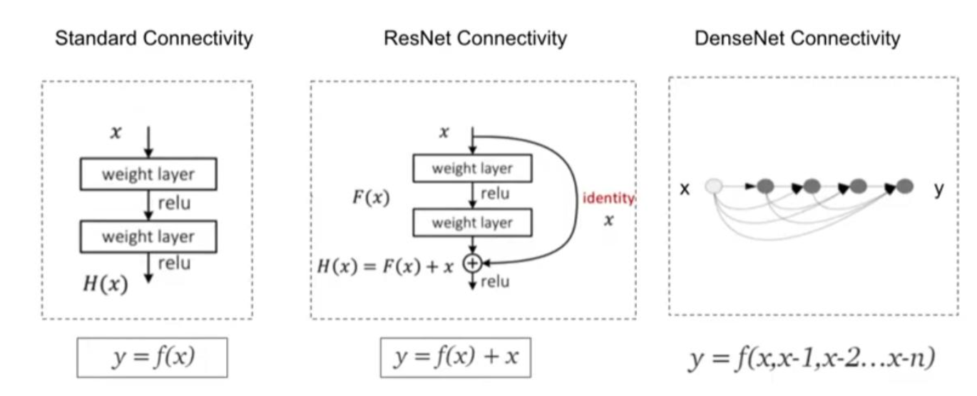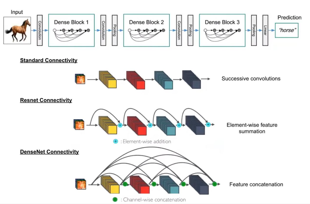 Dense connectivity : DenseNet은 각 층의 출력을 이후의 모든 층에 직접 연결하는 구조를 가진다.