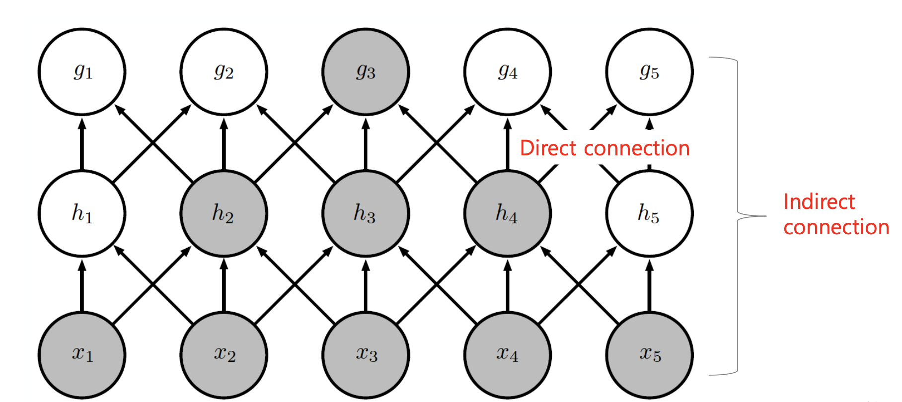CNN은 필터가 씌워진 부분과 뉴런이 직접으로 연결되며, 직접 연결이 형성된 특징의 영향력은 커지며, 간접 연결이 형성된 특징의 영향력은 작아진다.