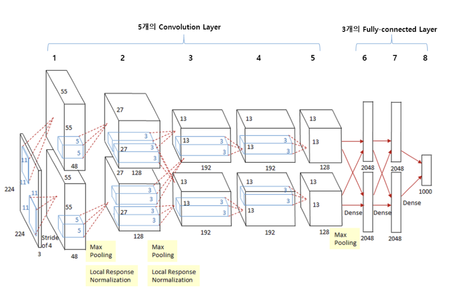 LRN(Local Response Normalization) : 동일한 위치를 공유하는 인접 채널의 뉴런들 간 정규화를 통해 특정 채널의 높은 활성화를 억제하는 기법