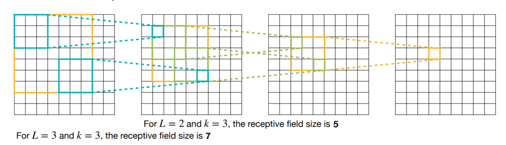 CNN의 합성곱 계층에서는 커널(필터)을 활용하여 데이터의 일부(Local)에만 합성곱 연산을 수행하며, 필터가 적용되는 영역을 수용 영역(Receptive field)이라고 한다. 이는 모든 입력에 대해 연결되는 MLP(Dense Connection)과 대비된다.