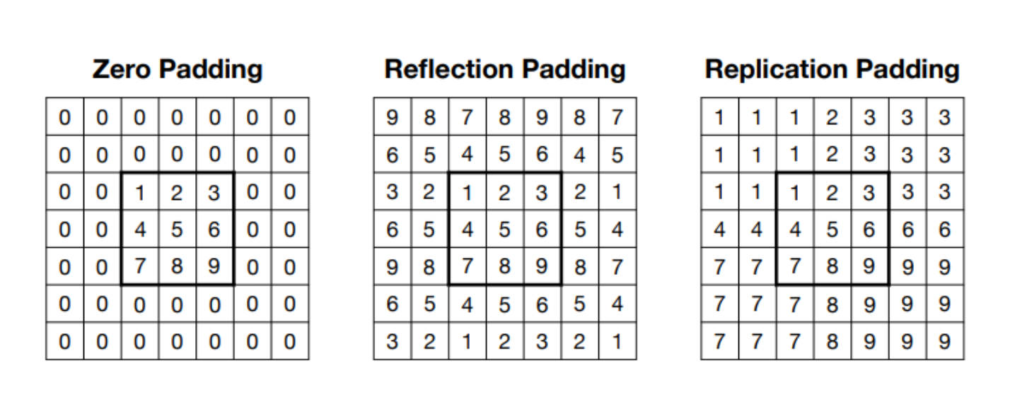 Zero-padding이 가장 일반적으로 사용되며, 이는 입력의 경계에 0으로 채워진 여백(Padding)을 추가하는 기법이다. 그 외에도 여러가지 종류의 패딩이 존재한다.