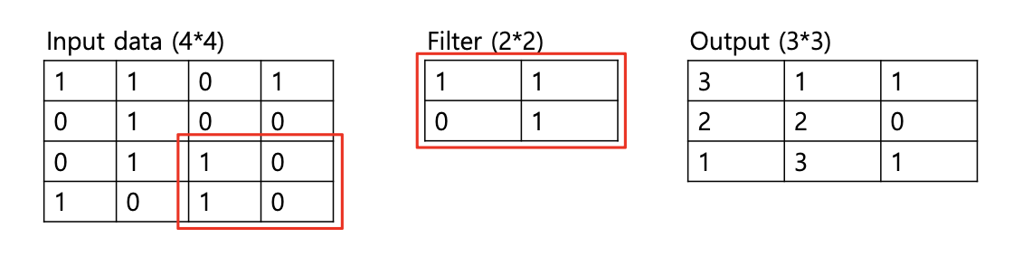 파라미터 공유(Parameter sharing) : 동일한 필터를 이미지 전체에 대해 적용하므로, 학습해야 할 파라미터의 수(=Filter size)가 매우 적다.