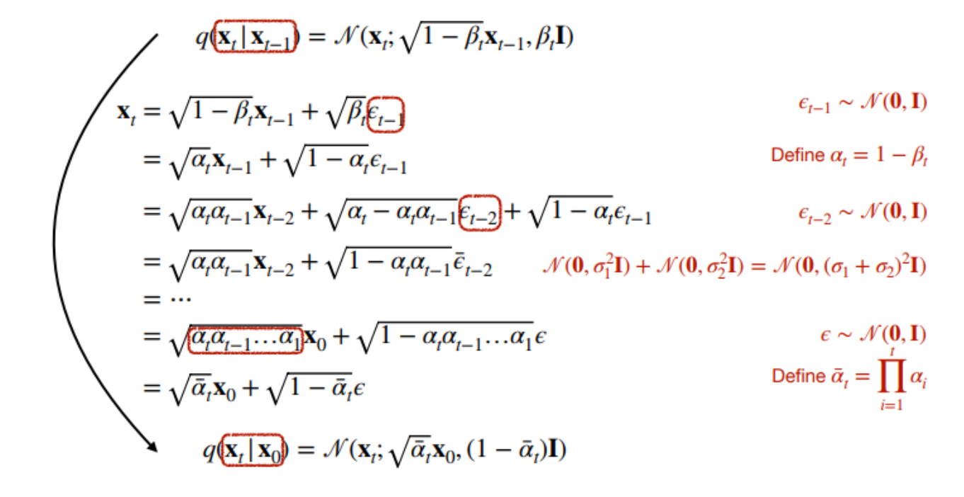 결국 입력 이미지 x0가 주어졌을 때 특정 시점 t의 확률 분포는 다음과 같이 정의된다.