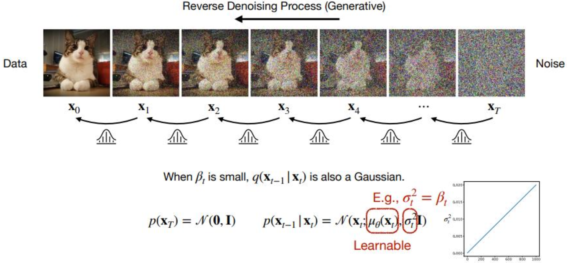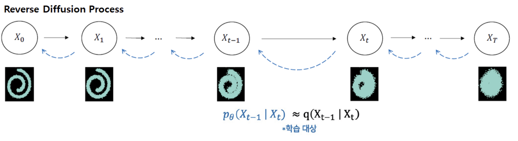 따라서 Reverse process는 Forward process를 한 단계씩 되돌리며 가우시안 분포를 따르는 이미지 xT를 원본 이미지 x0의 분포로 복원하는 과정이다.