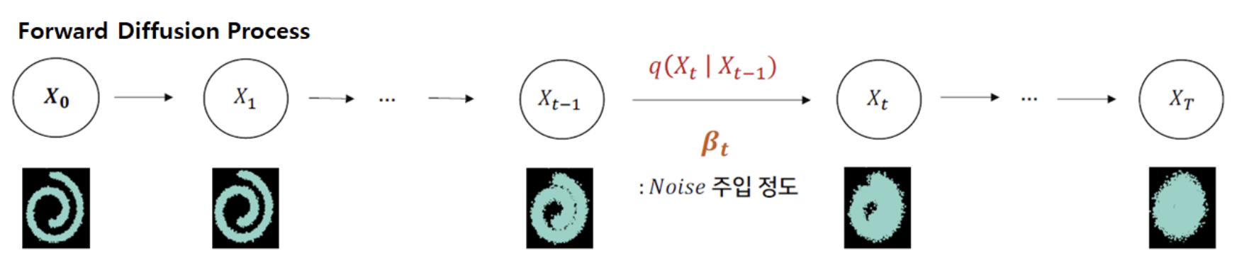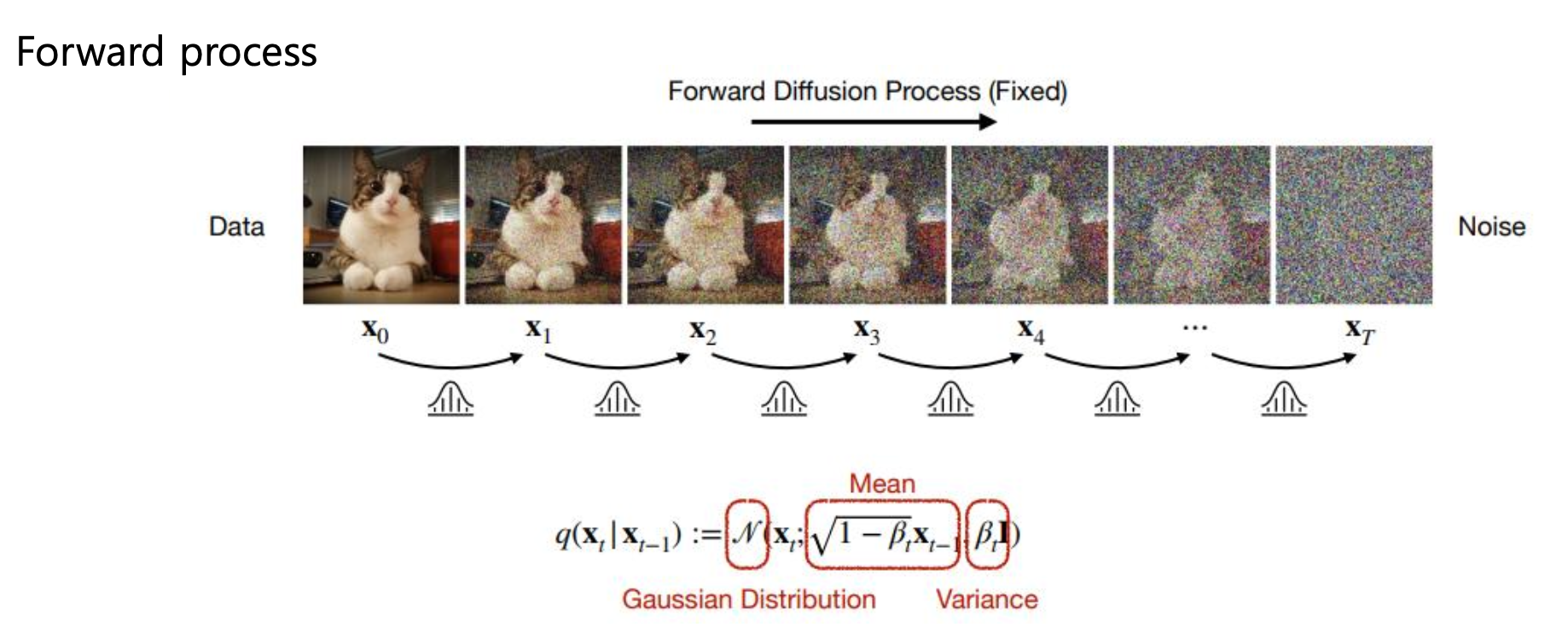 매 Time-step마다 원본 이미지 x0에 고정된 가우시안 분포에서 추출한 노이즈를 추가하는 과정이다.