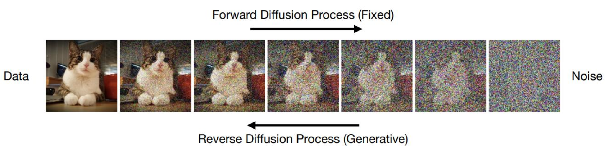 Diffusion Model의 목표는 노이즈 이미지를 원본의 이미지로 복원하는 것이며, 이 과정에서 원본 이미지의 데이터 분포에 대한 학습이 이루어진다.