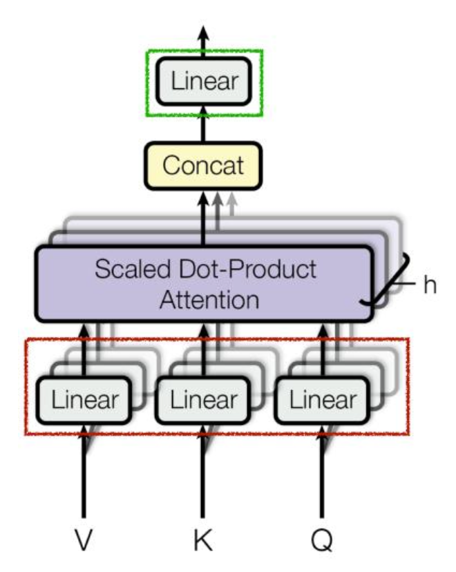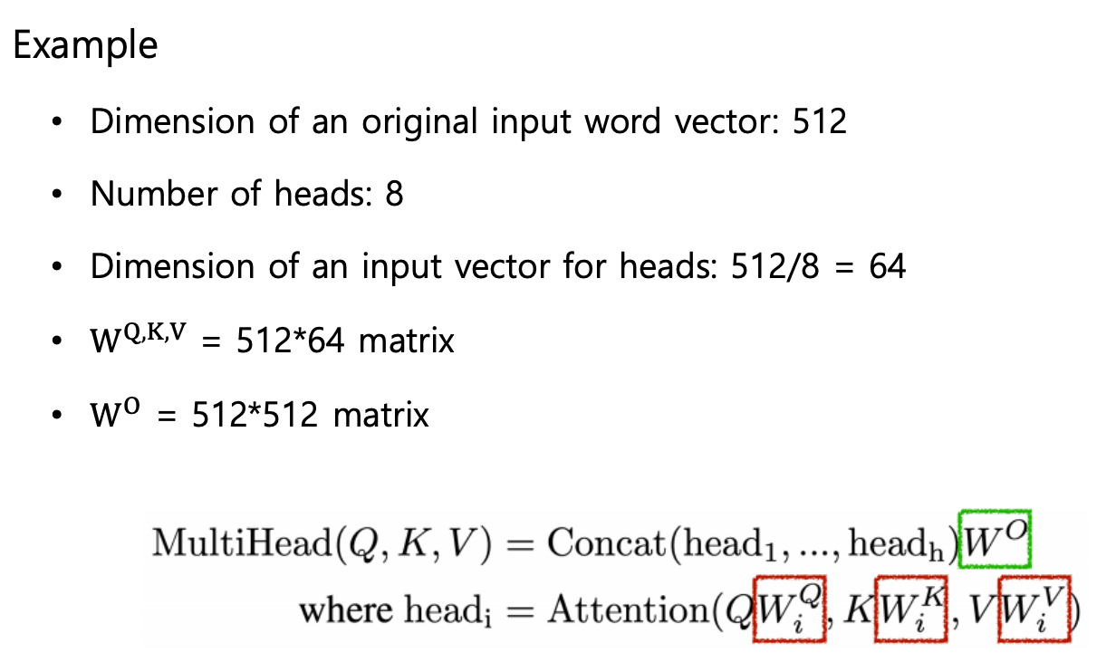 여기서 는 각 Head별로 갖는 학습 가능한 가중치 행렬에 해당한다.