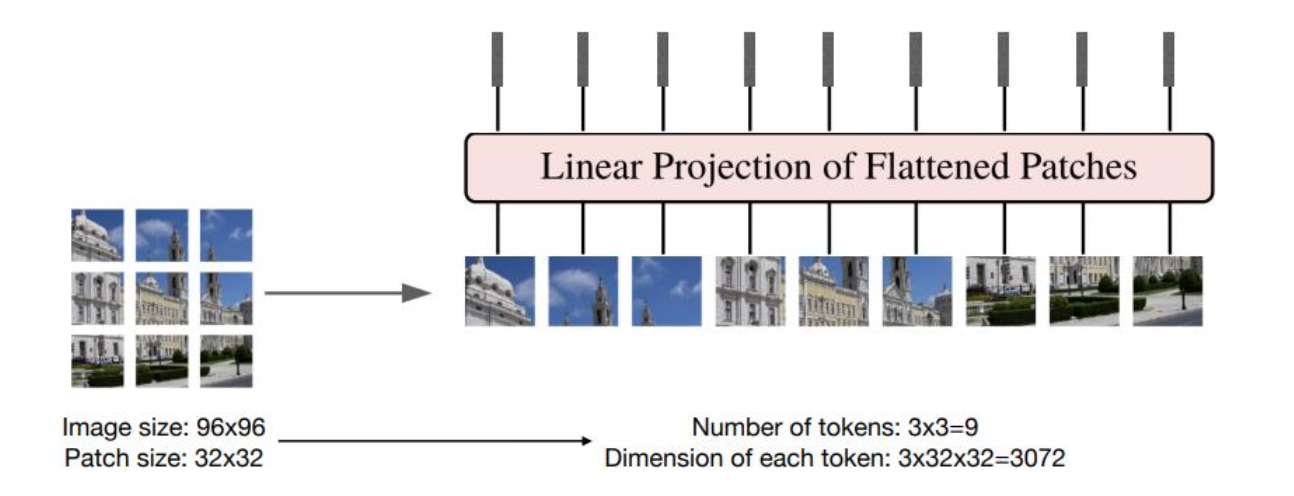 이미지는 작은 정사각형의 패치로 쪼개지며, 각 패치들은 하나의 토큰으로 간주된다.