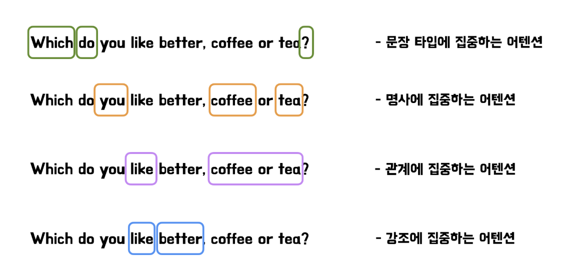 일반적인 어텐션 메커니즘은 디코더가 현재 출력하고자 하는 단어(Query)와 인코더의 단어(Key) 간의 관계를 계산한다.