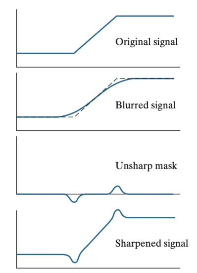 Unsharp masking : 이미지를 더욱 선명하게 만드는 데 사용되는 기법 중 하나로, 이미지의 픽셀의 경계를 더 강조하는 효과가 있다. 이 방식은 다음과 같은 단계로 구성된다.