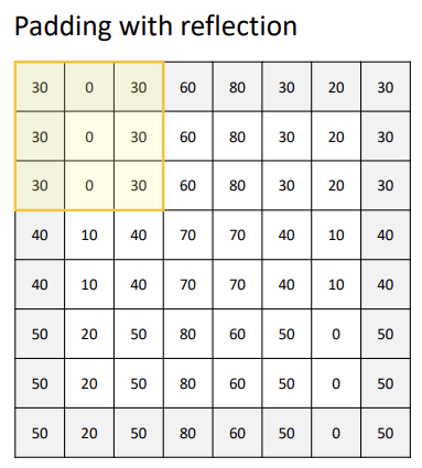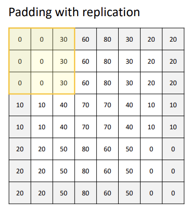 Padding with replication : 가장자리 픽셀을 복제하여 벗어난 부분을 채운다. 이 방법은 이미지의 가장자리 정보를 유지하므로 가장자리의 필터 값 변형을 최소화 한다.