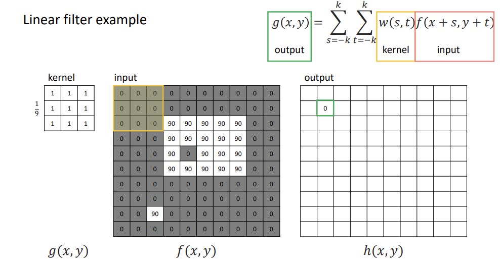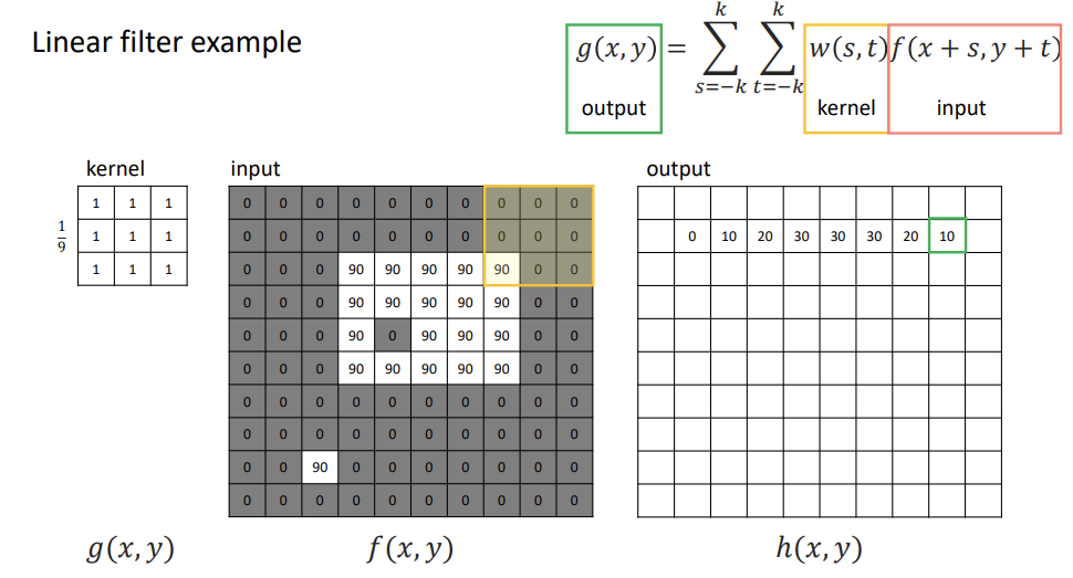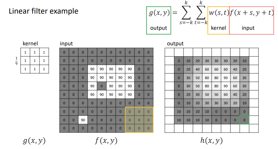 Linear Filter : 선형 필터는 이미지 와 필터(커널, 마스크) 사이의 곱셈 합 연산을 수행한다.