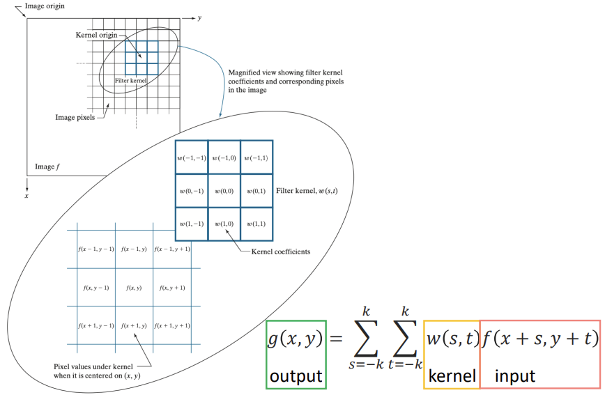 커널 는 연산 대상의 이웃을 정의하는 크기의 배열, 계수는 필터의 성격을 결정한다.
