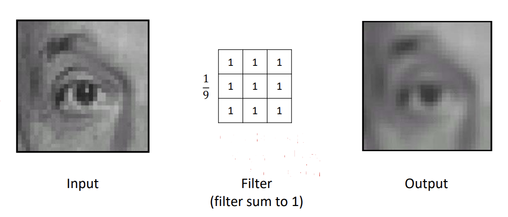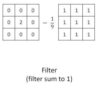 마찬가지로 전체적인 밝기가 변하지 않도록 하려면 필터 전체의 합은 1이 되어야한다.