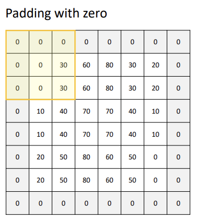 Padding with zero : 이미지의 가장자리 벗어난 부분을 픽셀 0으로 채운다. 가장 간단한 방법이지만, 이미지의 가장자리에서 필터의 값이 변형될 수 있다.