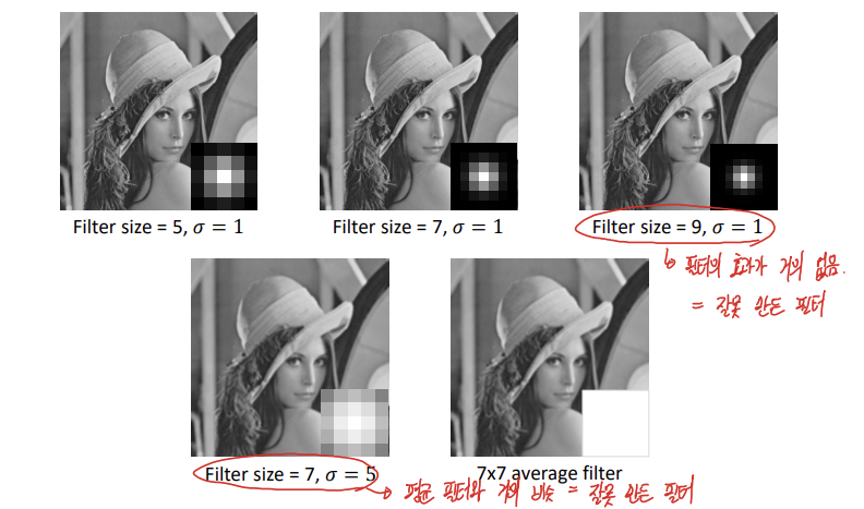 Creation Gaussian Filter : 가우시안 필터의 사이즈와 시그마 값을 적절히 조절해야 "가우시안 필터링"의 효과를 기대할 수 있다. 만약 두 값을 조절하는 것에 실패하면, "가우시안 필터링"과 "평균 필터링"의 결과가 거의 동일하게 나올 수 있다.