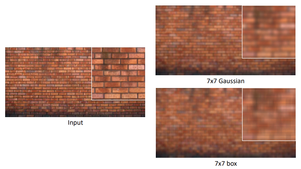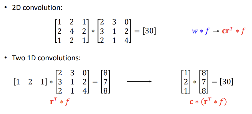Separable filtering : 필터를 두 개의 벡터의 외적으로 분리하여 표현할 수 있다면, 가로 방향에 대한 필터링과 세로 방향에 대한 필터링 총 두 번의 필터링을 적용하여도 결과는 동일하다.