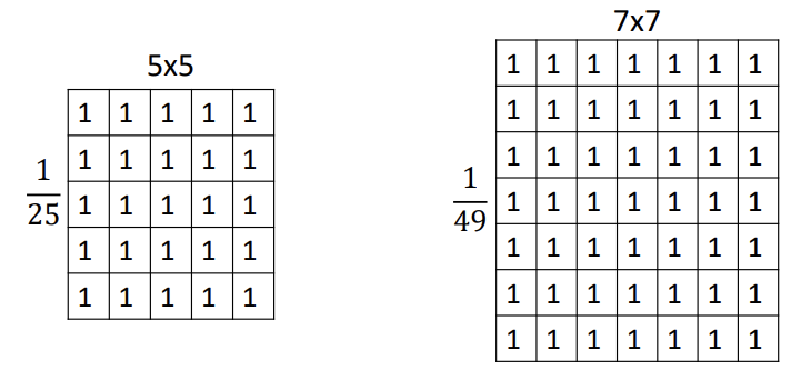 평균 필터 내부의 모든 픽셀 값은 동일한 양의 값을 가지며, 그 값들의 합은 항상 1이다.