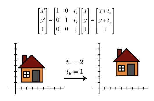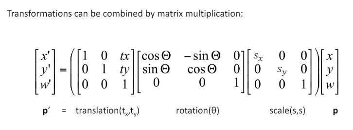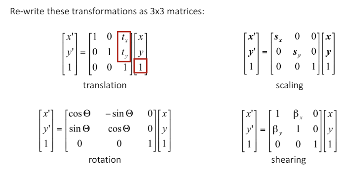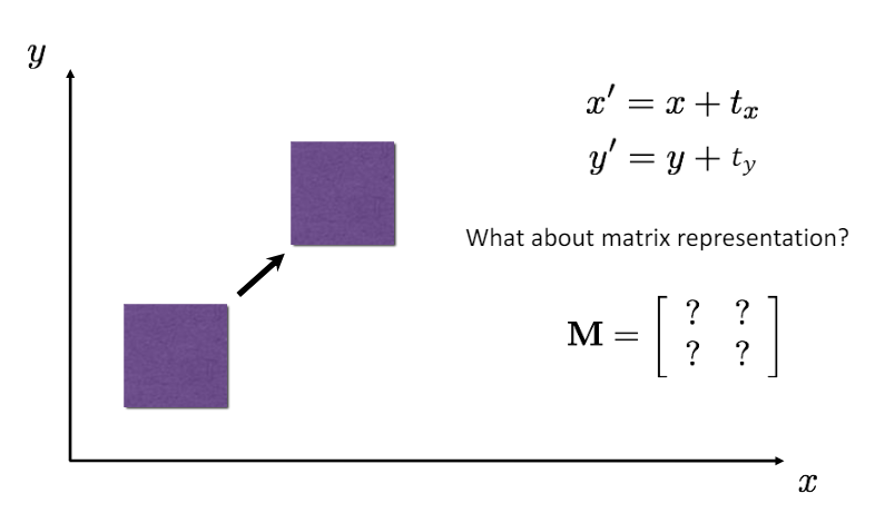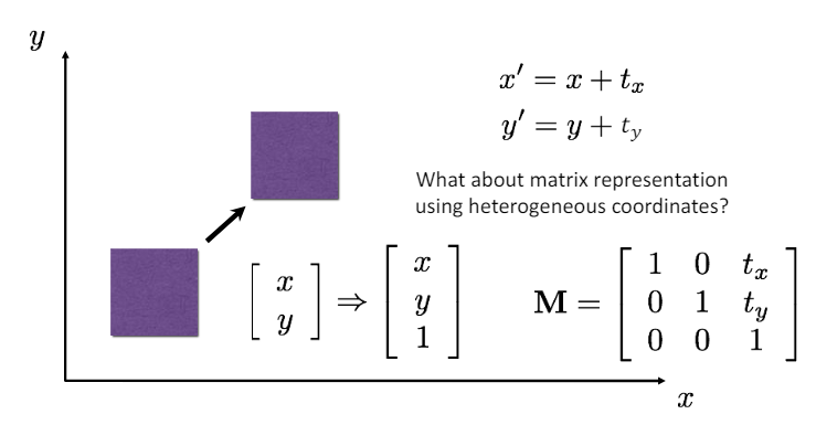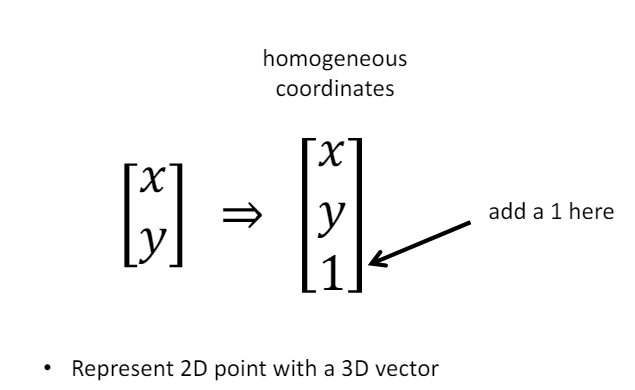 대신, 행렬 곱으로 표현하기 위해 Homogeneous coordinates를 사용할 수 있다. 이는 2D Point에 의미 없는 값 1을 붙여서 3D Vector로 만들어 사용하는 방식이다.