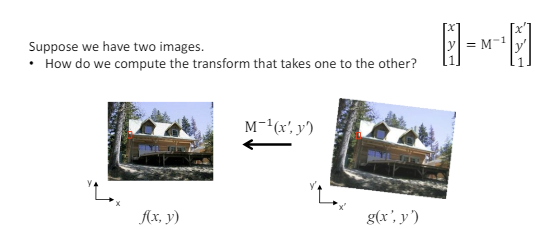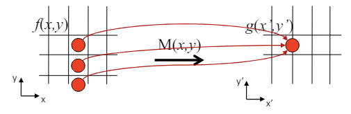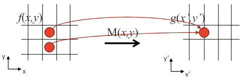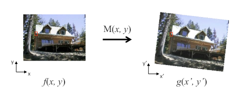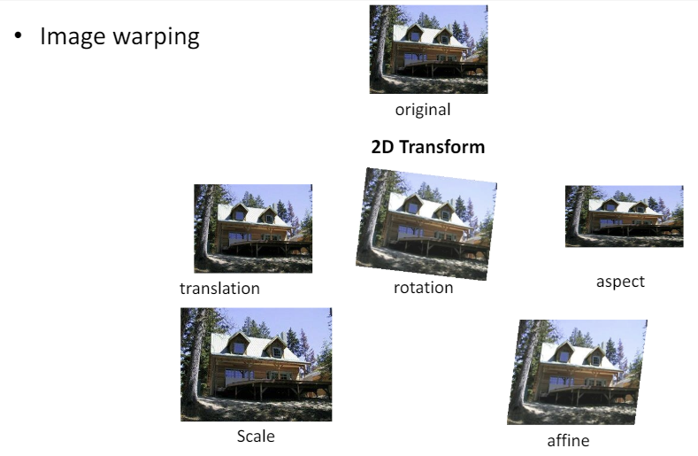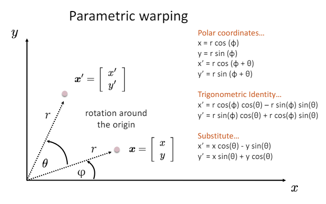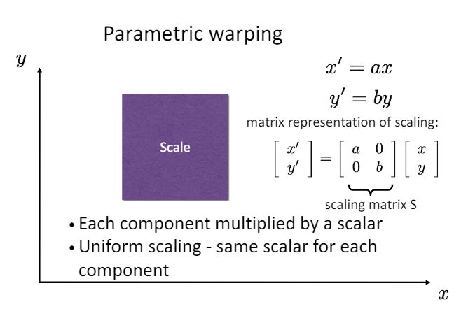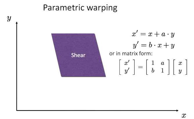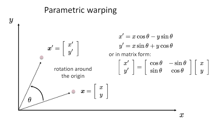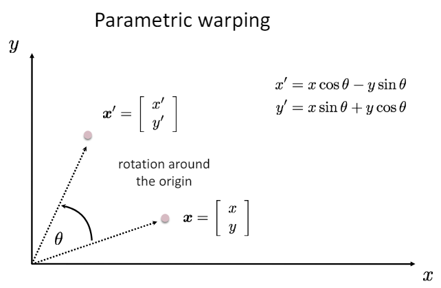 Parametric (global) warping : 파라메트릭 왜곡에서 변환 는 좌표를 변경하는 알고리즘으로, 점 의 좌표를 새로운 좌표 로 변환한다.