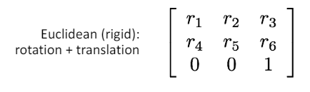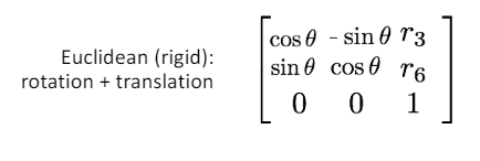 Euclidean Transformation (rigid, Rotation + Translation) : 유클리드 변환은 물체의 형상을 유지하면서 위치와 방향만을 바꾸는 변환이다. 즉, 회전과 평행 이동의 합으로 볼 수 있다.
