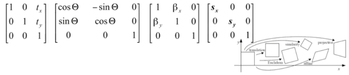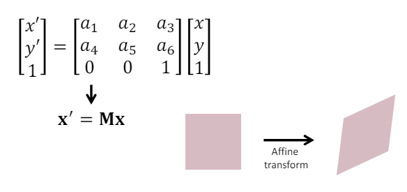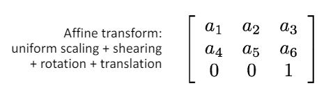 아핀 변환은 [Scaling, Rotation, Shear] (Linear transformations) + Translation (평행 이동)이라고 할 수 있다.