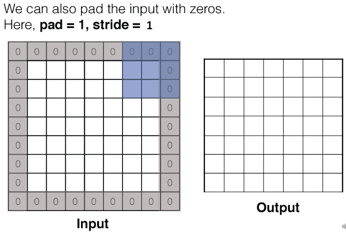 Convolution - Padding : 패딩 값에 따라 입력 이미지의 가장자리에 0으로 채워지는 두께를 조절할 수 있다. 즉, 패딩을 사용함으로써 입력 이미지의 가장자리까지 정보를 반영하여 결과를 출력할 수 있다.
