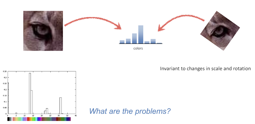 이미지 내 색상의 위치 정보를 고려하지 않기 때문에, 두 이미지가 색상 분포만 같고 전혀 다른 배치를 가진 경우에도 동일한 히스토그램을 갖는다.