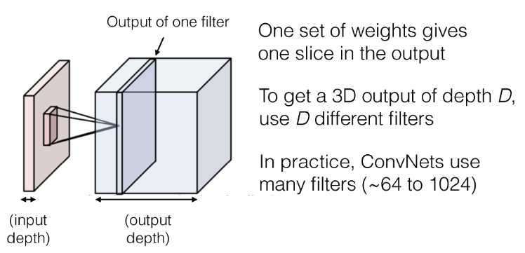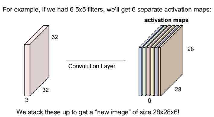 이렇게 여러 필터가 적용된 특징 맵들을 층으로 쌓아 최종적인 출력 이미지를 생성해간다. 이때 출력 깊이는 사용된 필터의 수에 따라 결정(개의 필터를 사용하면 출력 깊이는 )된다.