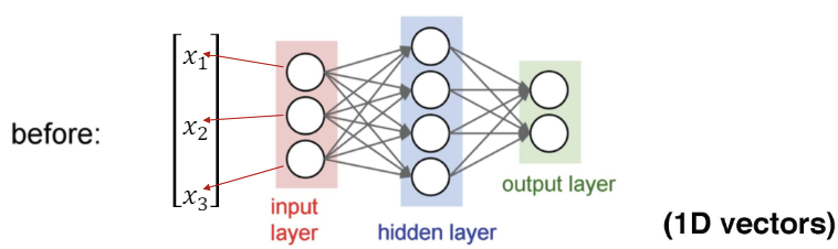 전통적 신경망 (Tranditional Neural Networks) : 전통적 신경망에선 입력 데이터가 1D 벡터 형태로 처리된다. 입력 레이어, 숨겨진 레이어, 출력 레이어로 구성되며, 모든 노드가 서로 연결되어 있다.