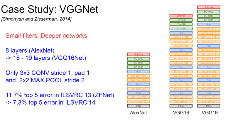 VGGNet : 더 작은 필터를 사용하며, 더 깊은 네트워크를 구축한 모델이다. 높은 연산량과 메모리 사용량으로 인해 복잡도가 높지만, 정확도가 높다.