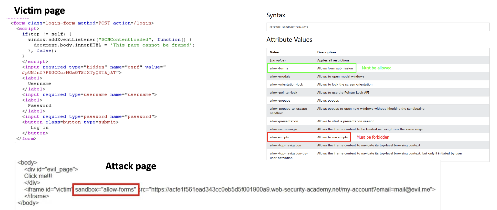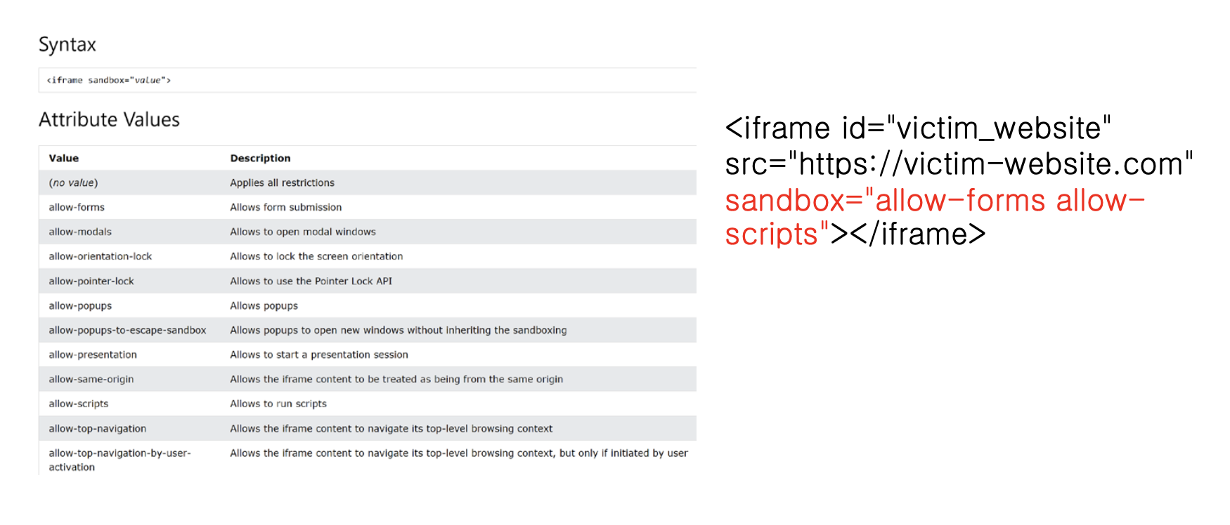 속성을 활용해 iframe 내부의 script 실행을 제한하여 프레임 버스터 코드가 실행되지 않도록 막을 수 있다.