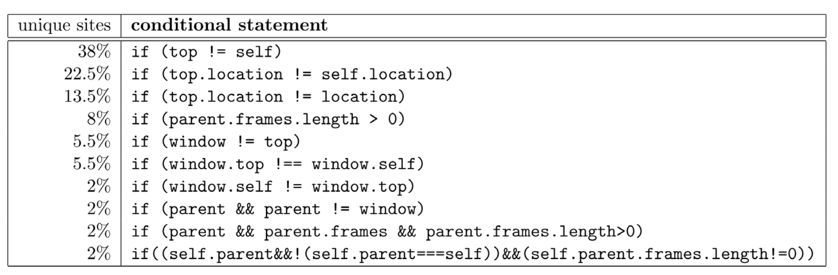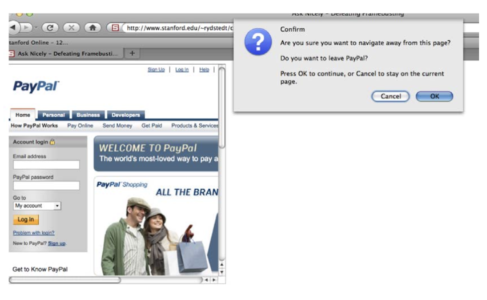 frame busting 코드가 top.location을 바꾸려고 시도할 경우 사용자에게 알림이 떠 페이지를 벗어나지 않도록 유도할 수 있음.