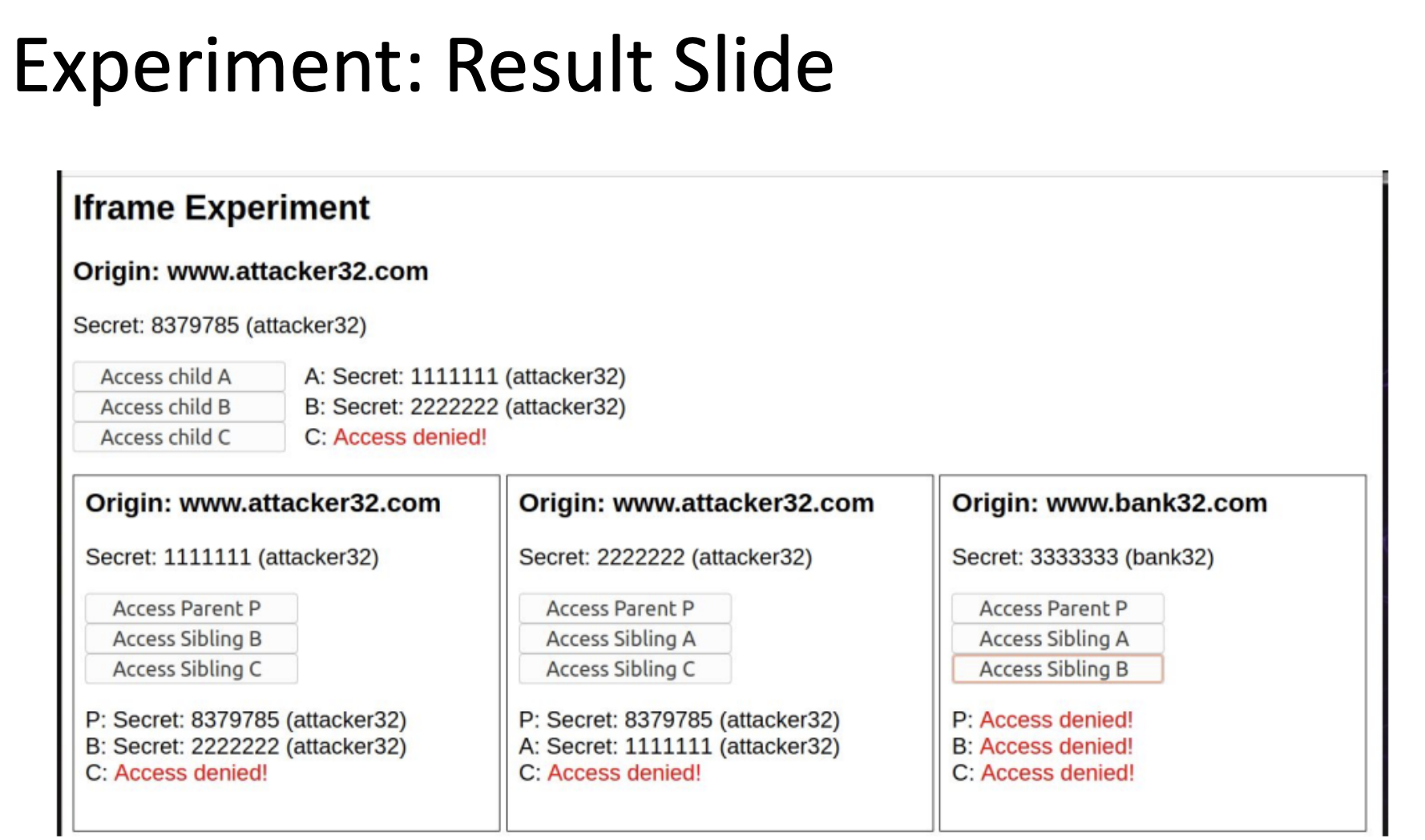 즉, iframe의 SOP로 인해 접근에 대한 결과는 다음과 같이 나타난다.