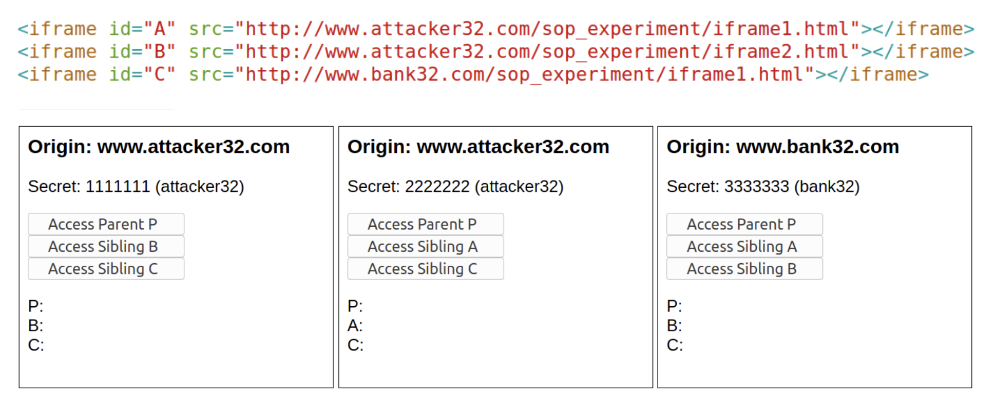 iframe A와 iframe B는 동일한 Origin, iframe C는 A,B와 다른 Origin을 갖는다.