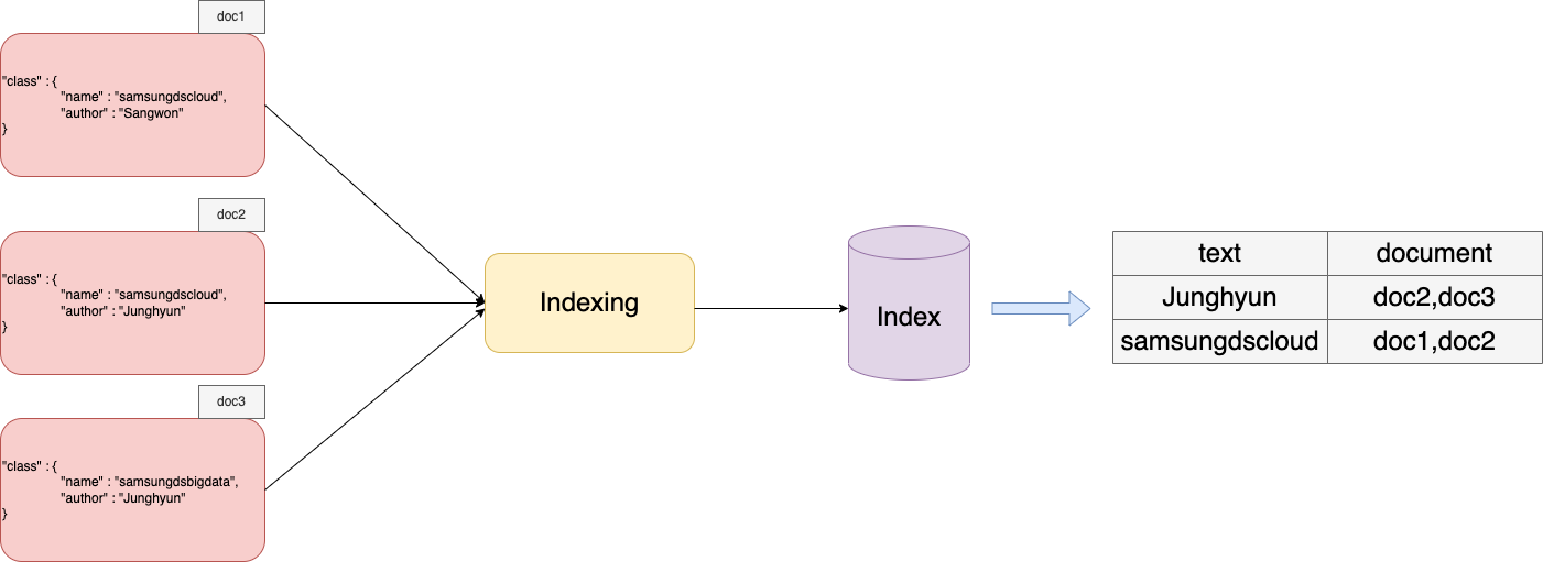 오픈서치 클러스터에 document가 들어오면 인덱싱이라는 과정을 통해 맨 오른 쪽 처럼 인덱스가 만들어진다.
