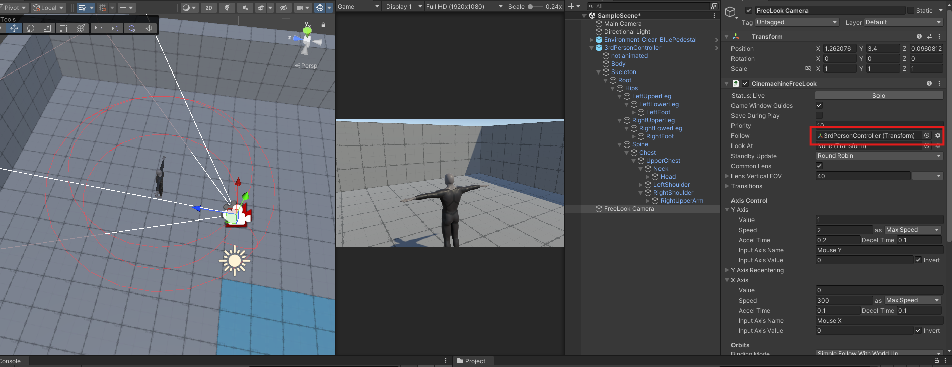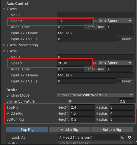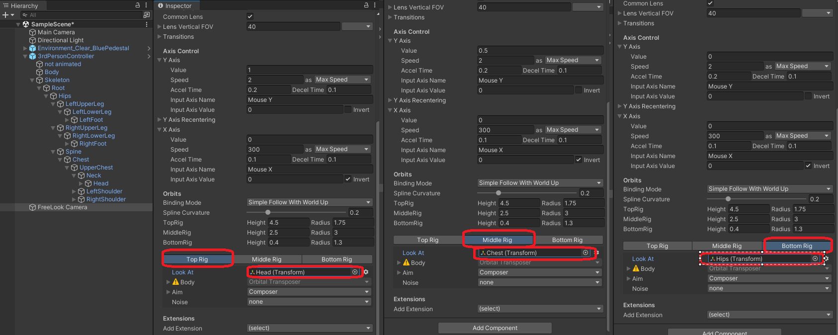 이후 카메라의 설정에서 Rig - Top Rig, Middle Rig, Bottom Rig에 각각 플레이어의 Head, Chest, Hips를 세팅한다.